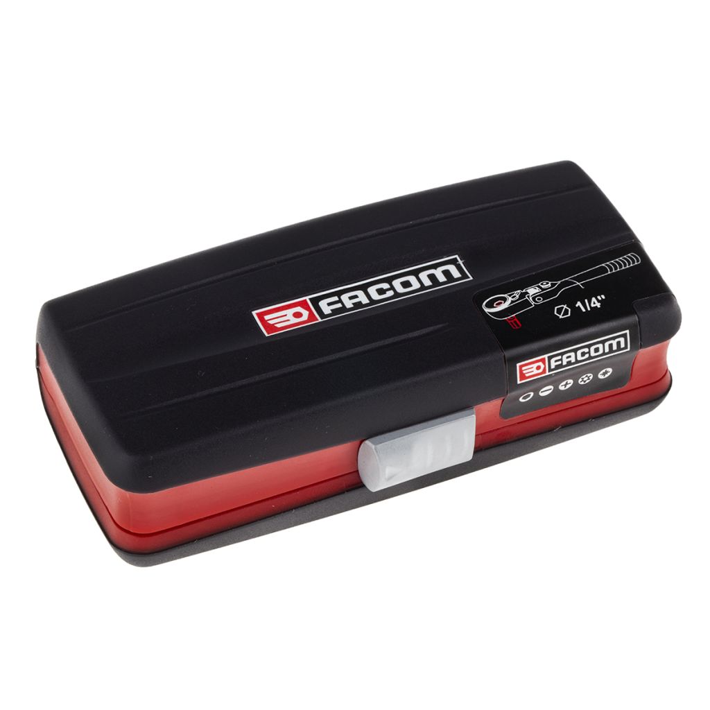 Facom presents to you their 31 piece bit set. A well thought out tool set for professional or DIY applications. This kit was created for the user who wants more from their tools so Facom has developed this set to withstand extreme and intensive conditions with professional quality. Inside the plastic case you are presented with a compact flex ratchet, 28 of the most commonly used assorted bits and a 100 mm bit holder. Each piece has its own designated compartment so you can keep everything nicely organised.