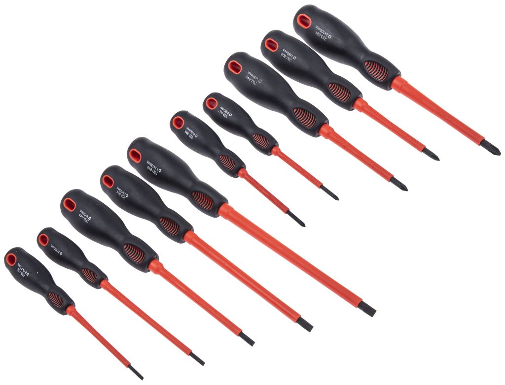 An insulated screwdriver is constructed from non-conductive materials, in this set that material being a rubbery silicone. This is to prevent the user from the possibility of touching live parts of a circuit. By having the shaft and handle of the screwdriver protectively coated it ensures the safety of the user when in an electrical environment. Screwdrivers are used for insertion and removal of screws, there are a multitude of variations which correspond to the correct screw drive. The average screwdriver will consist of an ergonomically designed handle and a shaft with a drive tip. A screwdriver is classified by its tip, which is specifically designed to fit into a driving surface such as slot and groove.
