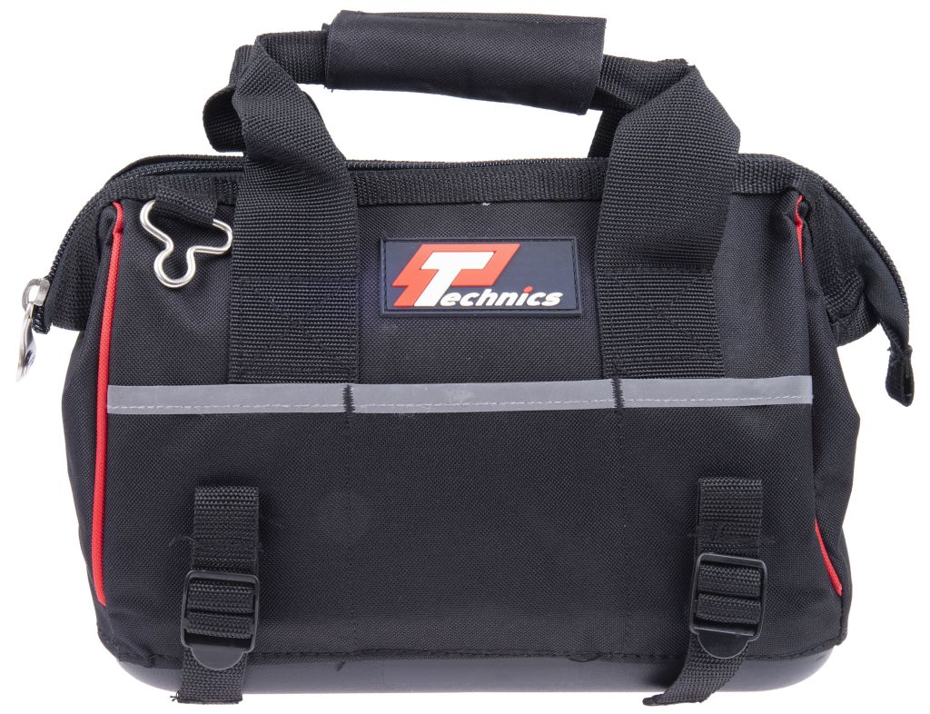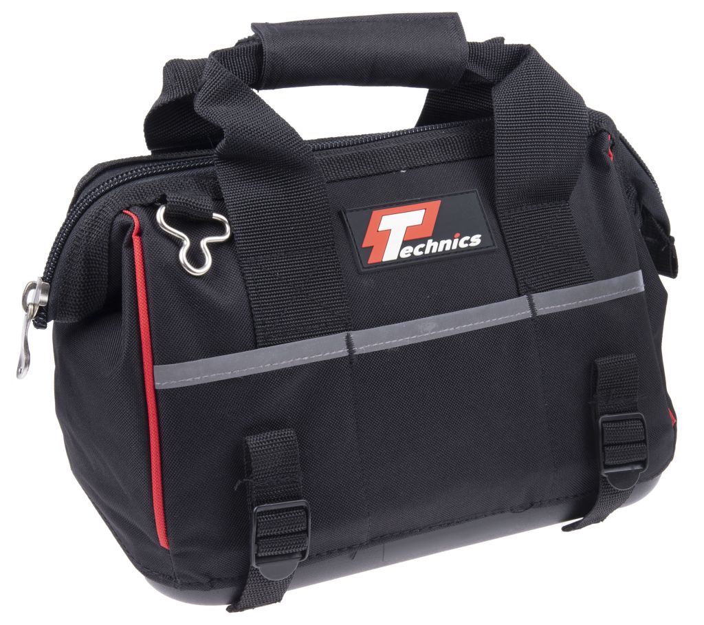 This Professional tool bag from Technics is made from tough reinforced 600 denier fabric. It features an adjustable shoulder strap, hard plastic bottom and selection of inner and outer pouches. This stylish, functional and robust tool bag from Technics have a professional design specifically to protect tradesman tools.