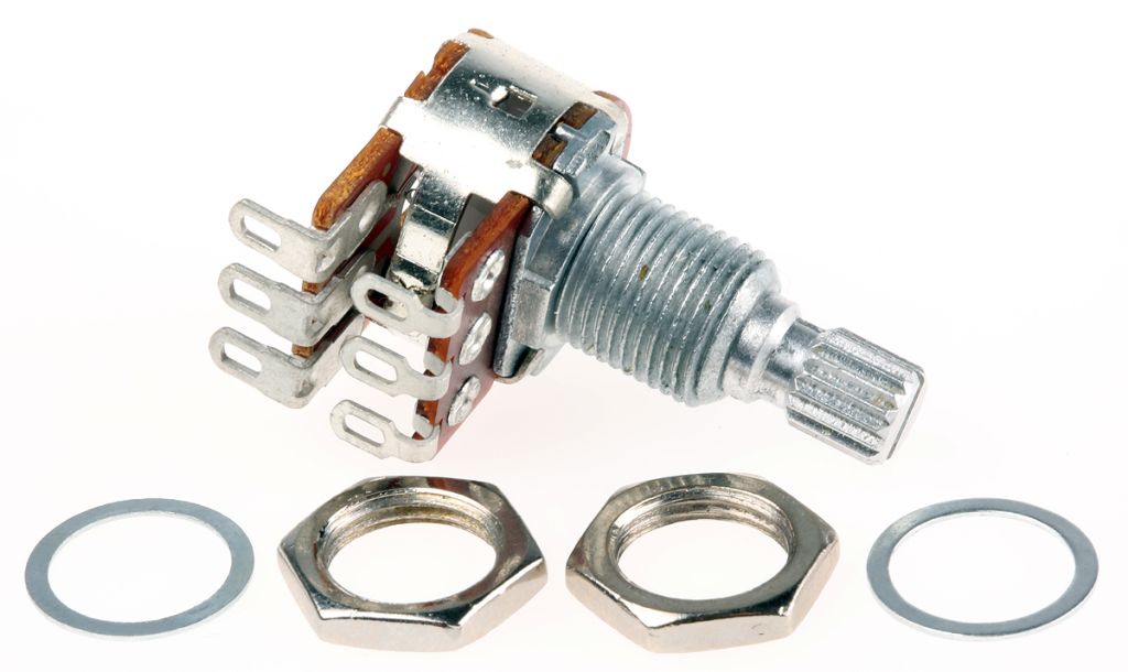 Bourns PDB182-GTRB series dual gang, 17 mm blend-balance "guitar pots". The PDB182-GTRB series potentiometers are available in a two resistance values and with a centre detent as standard.