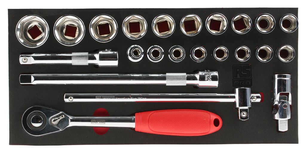 The set is kept within a foam tool module for easy transportation and organisation. This foam insert is designed to fit neatly in the drawers of tool cabinets, such as the RS PRO Range of heavy duty tool cabinets.