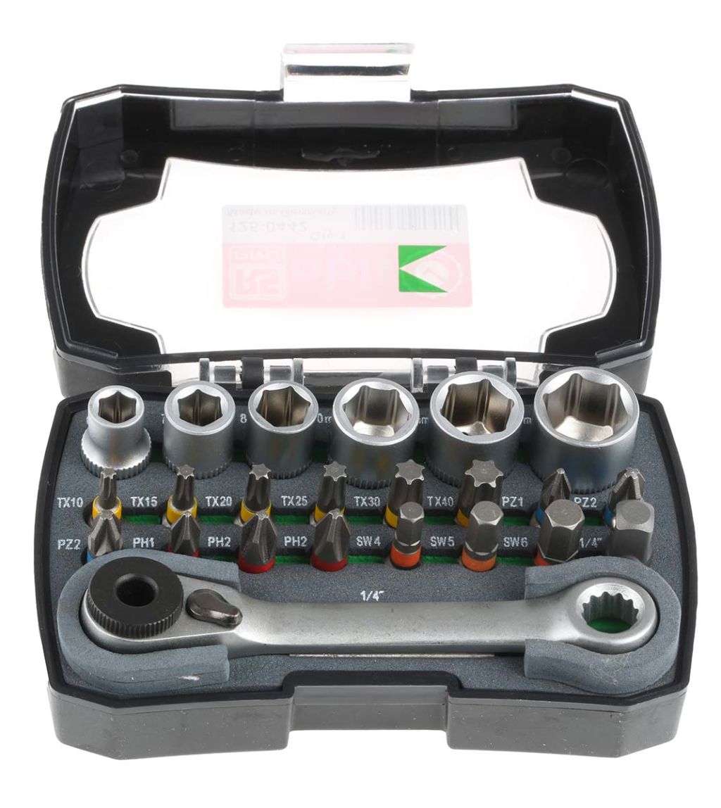 RS Pro 24 piece Colour ring bit and nut setter set offers a comprehensive range of popular screw bits and nut setters in one handy set. Colour coded bits to make size identification easier. Magnetic bit holder included. Also, 1/4” Hex adapter and hand ratchet included.