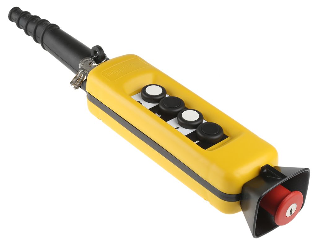 Created and designed for predominantly standard or medium-duty control circuit applications, Schneider Electrics push-button pendant station provide a covering case for the internal push button. The enclosures are made up from a rugged, double insulated thermoplastic material. This unit is a simple yet effective mechanical switch which is commonly used to control the hoist and lowering function within a machine or device. Strategically designed for easy handling and operation, even when the user is wearing heavy work gloves.