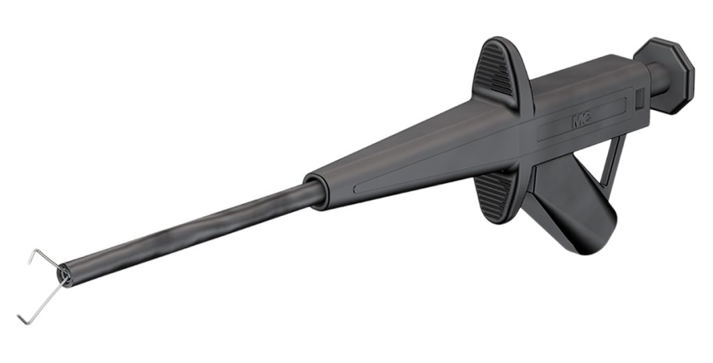 SKPS-4 test clips with a flexible silicon insulated shaft and a stainless steel wire grabber, used when the contact point is in a inaccessible place. The silicone insulation has good heat resistance properties and remains flexible at low temperatures. In red or black colours, complete with a rear 4 mm socket that accepts safety plugs.