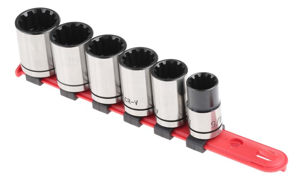RS Pro unique design of universal sockets allows each socket to be used on all common types of fasteners. SAE , 8 pt, 12 pt head nuts and bolts, E-torx and square types. Allows you to carry fewer tools with a wider range of applications.