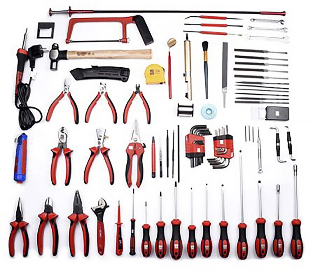 | Set Contents | Cutters, Files, Hammer, Hex Keys, Knife, Pliers, Precision Screwdriver, Saw, Screwdriver, Shears, Soldering, Spanners, Tape Measure, Voltage Tester, Wire Stripper, Wrench |