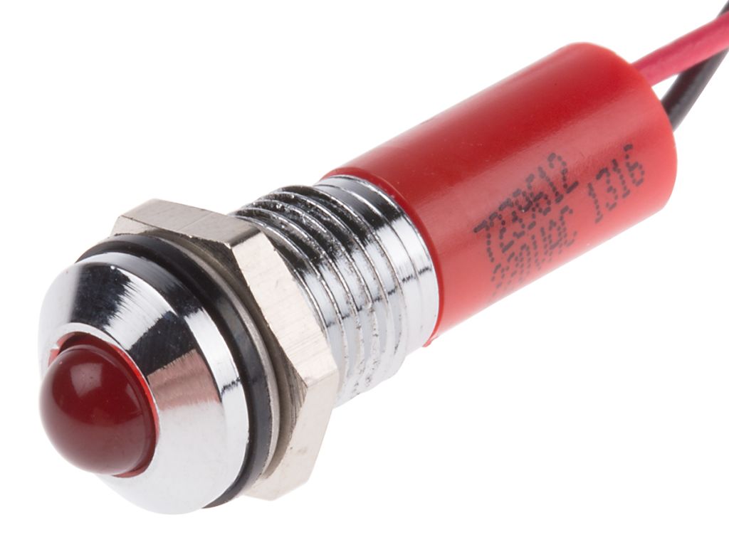 | Product description | RS PRO Red Indicator, 220V ac, 8mm Mounting Hole Size, Lead Wires Termination, IP67 |