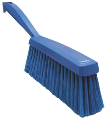 Hand brush with soft bristles is ideal for sweeping fine particles such as flour from conveyor belts, food preparation surfaces, tables and equipment.