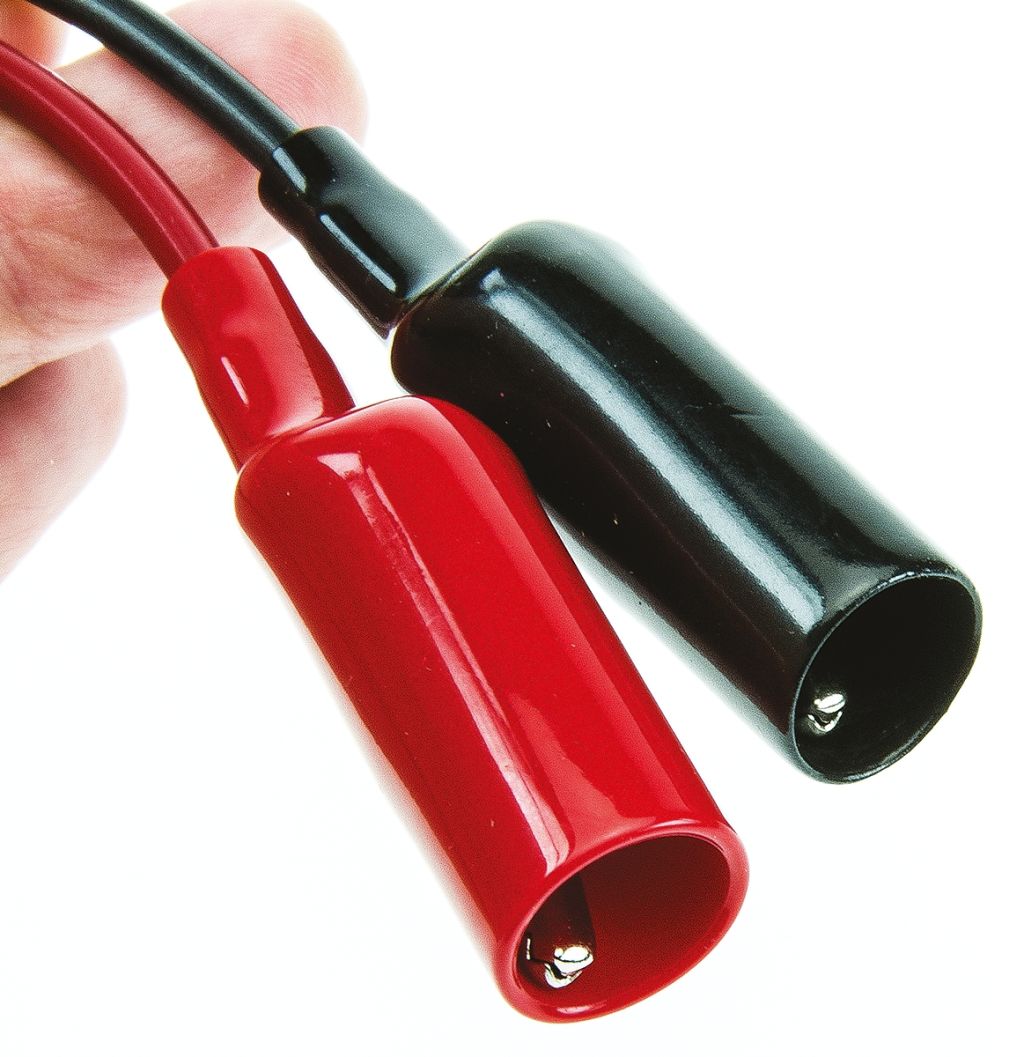 Moulded red and black cable assembly with a BNC female connector at one end. At the other end there is a red and black crocodile clip.