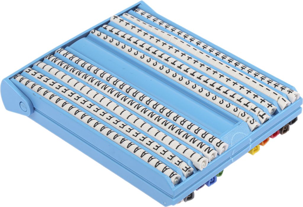 Neatly organised in a convenient dispenser HellermannTyton presents a PVC cable marker kit. Featuring 25 of each colour coded label numbered 1, 2, 3, 4, 5, 6, 7, 8, 9 and letters A, E, L, N, R, S, T, +, - and earth printed black on white.