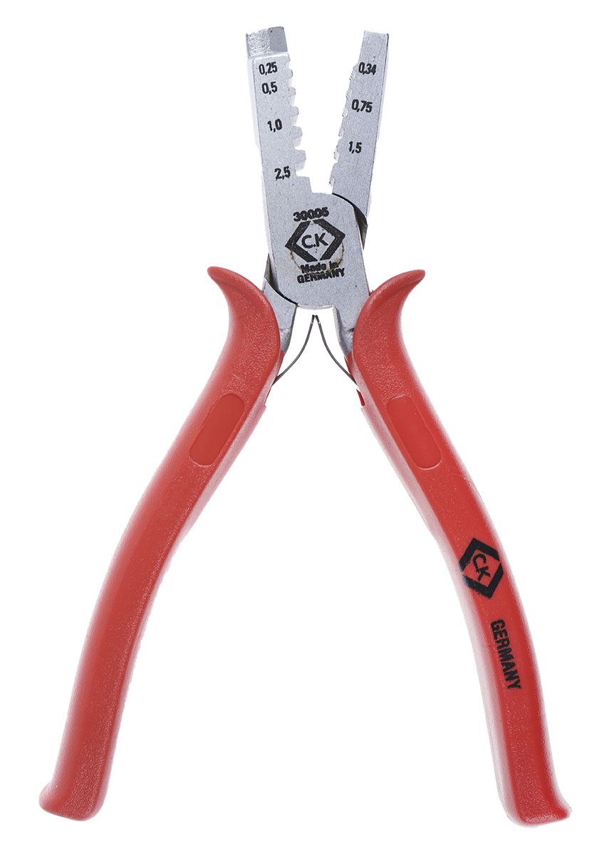 C.K Crimping Pliers are high-quality have been designed for professionals and serious DIY enthusiast. They are suitable for crimping bootlace ferrules. A frame made from hardened and tempered high alloy carbon steel, offer a long life and hassle-free operation. Pliers are matt chrome plated to ensure an increased corrosion protection. Especially shaped handles guarantee an anti-slip, safe and comfortable grip.