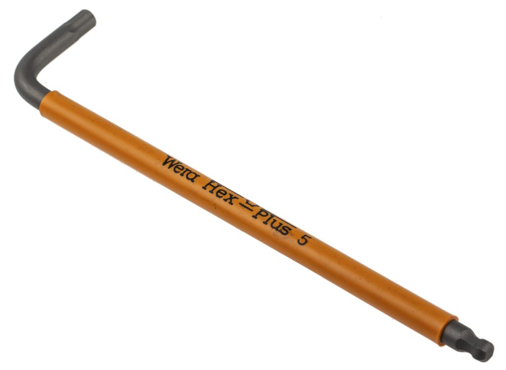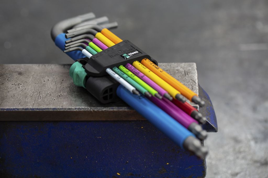 Wera 9 piece, L shaped hex-plus set that has been designed to ensure a larger contact surface inside the screw recess, reducing notching effect and enabling 20 % more torque transfer.