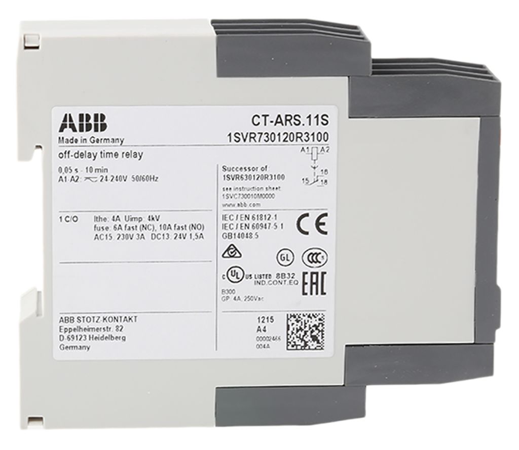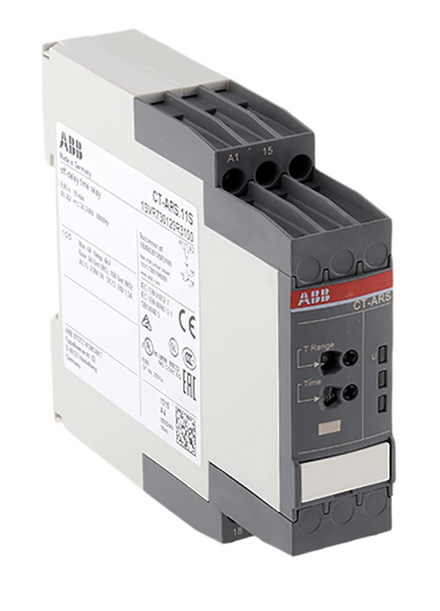 Product description ABB SPDT Timer Relay, OFF Delay without Auxiliary Voltage, 24 → 240V ac/dc 0.05 s → 10min, DIN Rail Mount