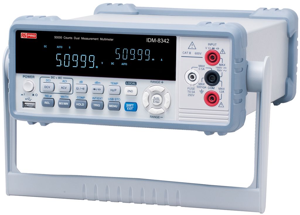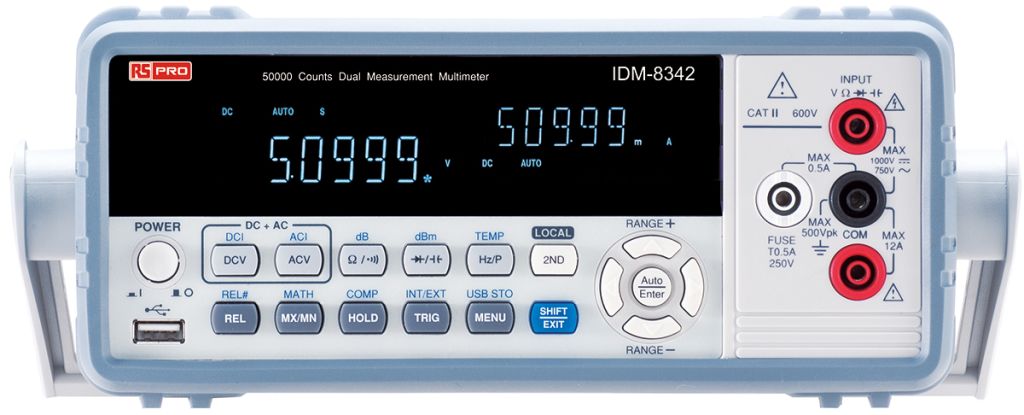 RS PRO IDM-8300 Series bench digital multimeters (DMM) include 50 000 counts, VF (vacuum fluorescent) dual-display, 0-02% basic DC voltage accuracy and a USB protocol connector. These features provide users with measurement precision, comprehensive data observation and the convenience of a connection to a PC.