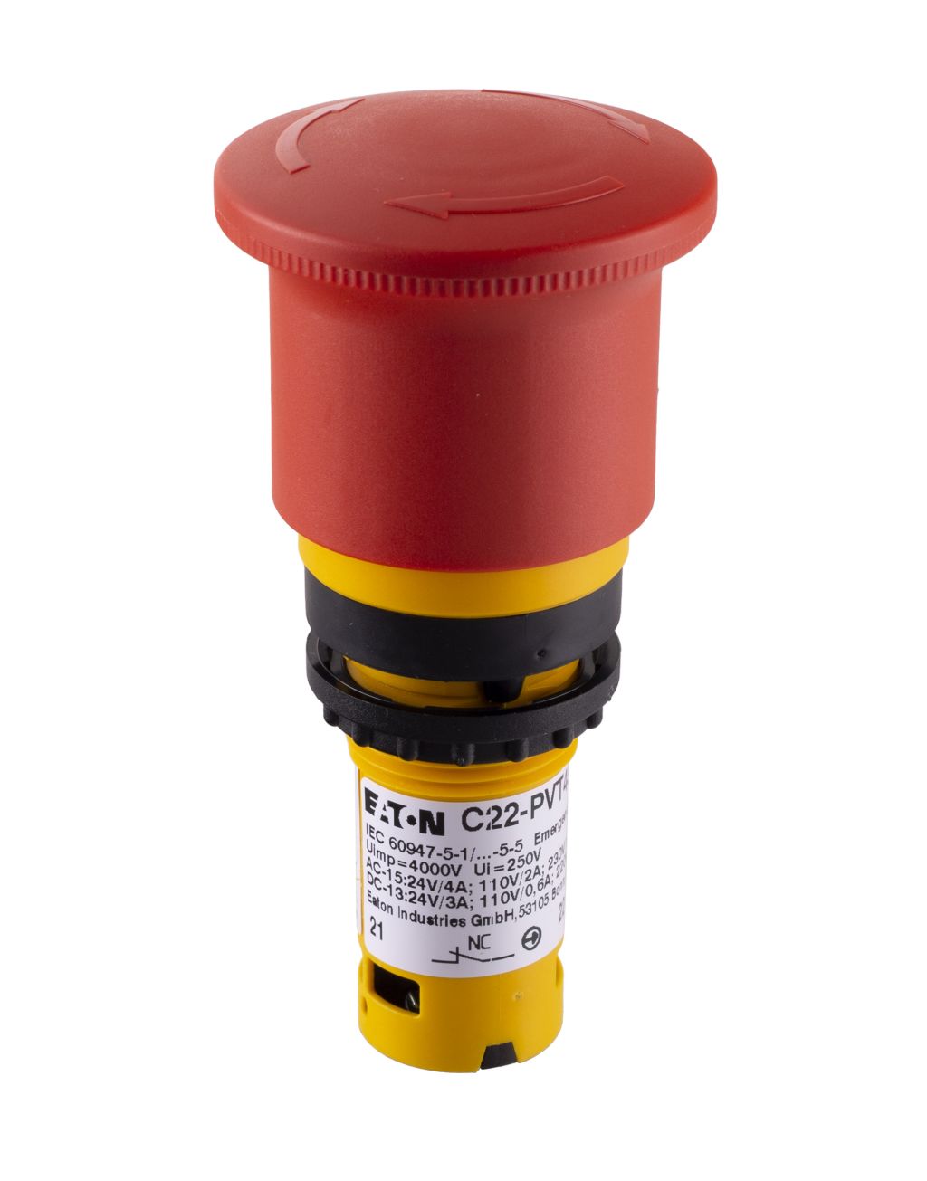 | Product description | Eaton C22-PVT Emergency Stop Push Button Panel Mount, 22.5mm Cutout, 2NC |