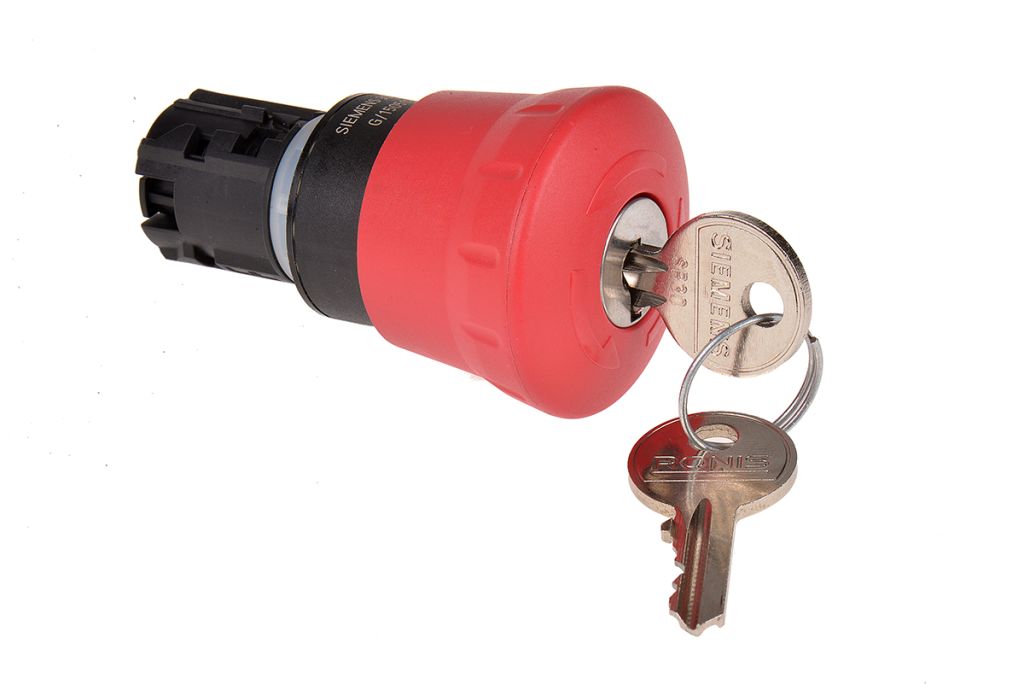 Siemens extremely rugged IP69K 22 mm e-stop mushroom push button heads in high-grade plastic.