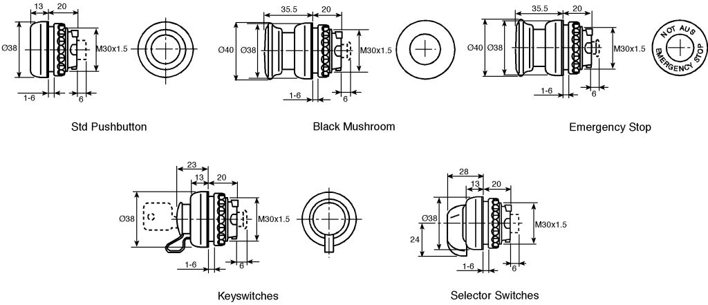 Panel mounting, with a wide range of switch contact arrangements and elements including; selector switches, key switches, standard pushbuttons and an emergency stop pushbutton. The actuators and lens units require a 30.5mm mounting hole. Ingress protection is to IP66 and they are component-approved in their own right. Switch and lamp modules include three metres of encapsulated cable. Switch modules include a wipe clean action and are rated up to 230Vac/16A (circuit type AC-12). The N/C contact has a positive break action.,The electronic circuitry of each lamp module self configures to allow the lamps to be used over a wide range of ac and dc voltages.,A simple cam arrangement on the modules provides a rapid method for the fitting of the actuators.