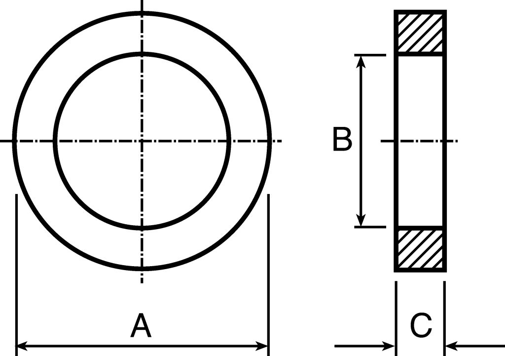 Line drawing dimensions: A=diameter; B=internal diameter; C=height