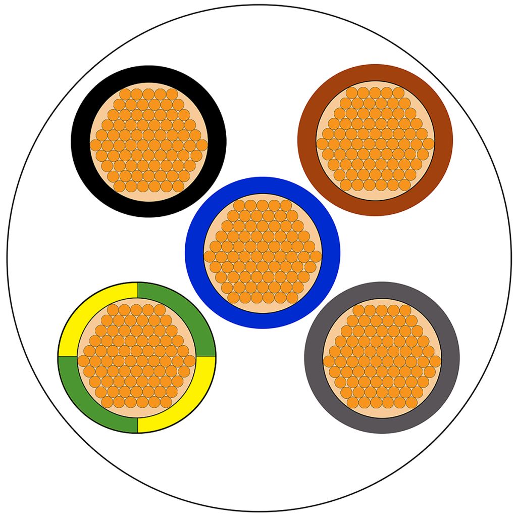This flexible electrical power cable consists of cores made up of fine stranded copper conductors or wires. Each individual core is surrounded by colour coded PVC (Polyvinyl Chloride) insulation for easy identification of the wires. All the cores are then surrounded by a final outer layer of PVC called a sheath or jacket.