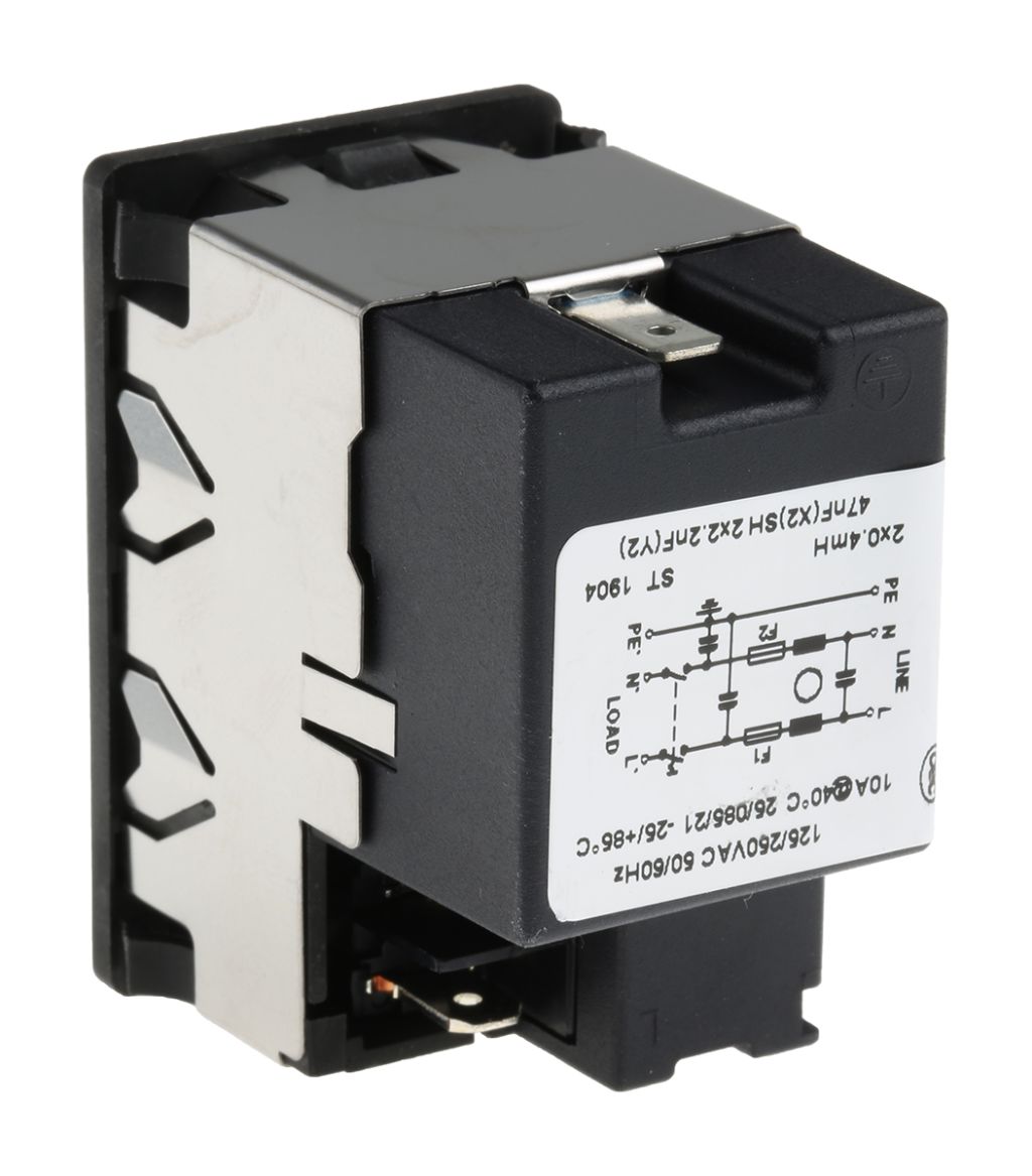 Schurter,10A,250 V ac Male Snap-In Filtered IEC Connector 2 Pole KMF1.1191.11,Solder 2 Fuse