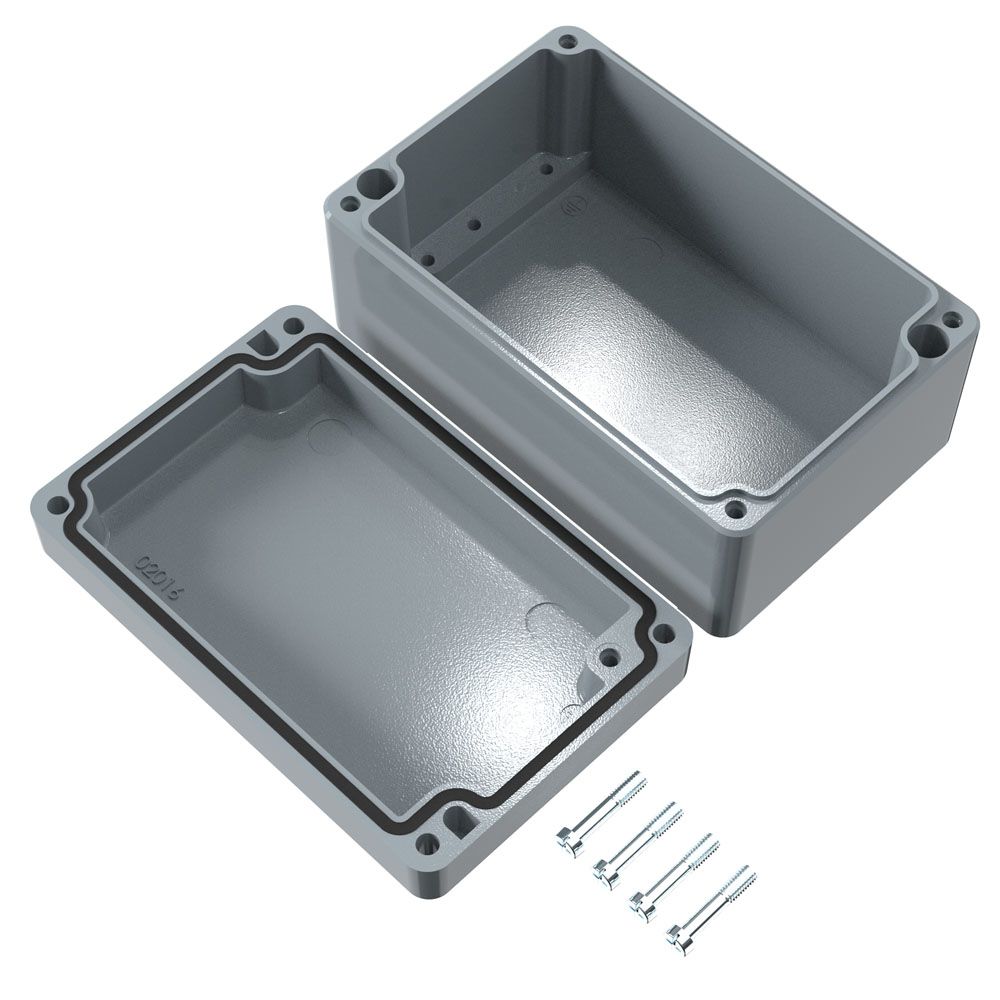 Aluminium enclosure consisting of lid, seal, Including Stainless Steel screws base with 2 or 4 earthing screws.