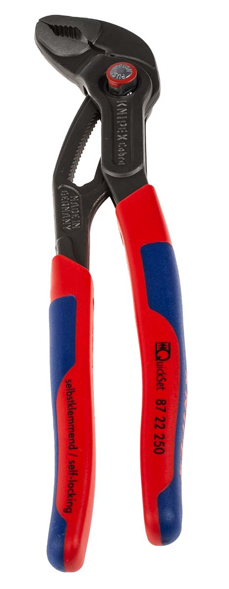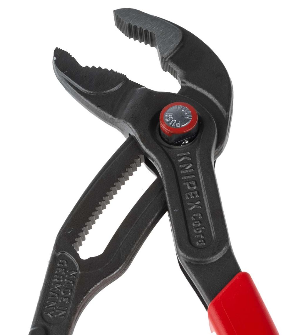 The Knipex Cobra® pliers is adjusted by shifting one jaw directly on to the workpiece and can then be opened at the touch of a button. The adjustment is fine for optimum adaptation to different sizes of workpieces and a comfortable handle width. The slim head design and joint area allows for good access to the workpiece and are self locking.