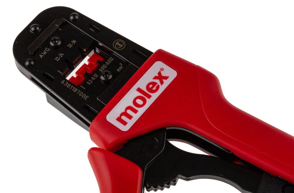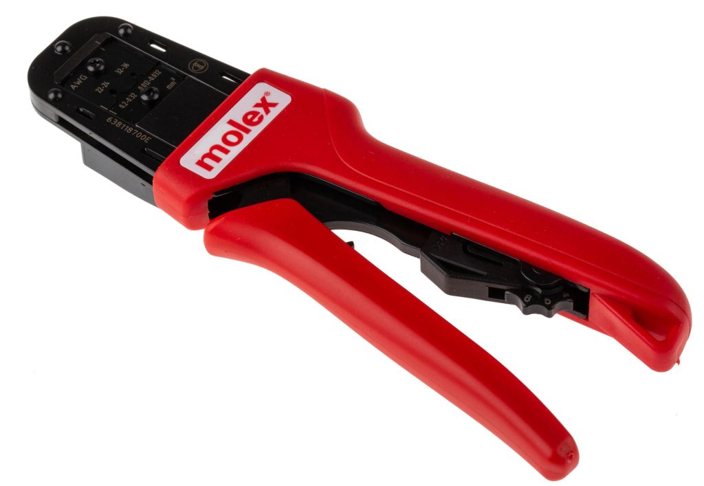 From Molex a PremiumGrade manual crimping tool made from high-quality materials and designed to crimp to a high specification. This PremiumGrade crimp tool has been tested to a minimum of 50000 cycles. If the tool is looked after and maintained it produces crimps to the highest specification during this life span. This crimping tool consists of two ergonomically designed soft grip handles with an adjustable preload force, ratchet mechanism, die assembly and terminal locator.