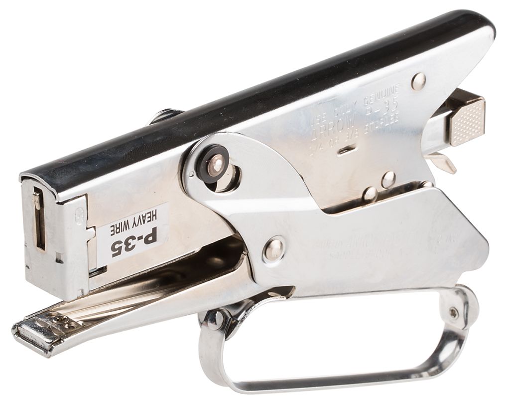 A handheld, plier action stapler of all steel construction with a durable chrome finish and easy to load mechanism