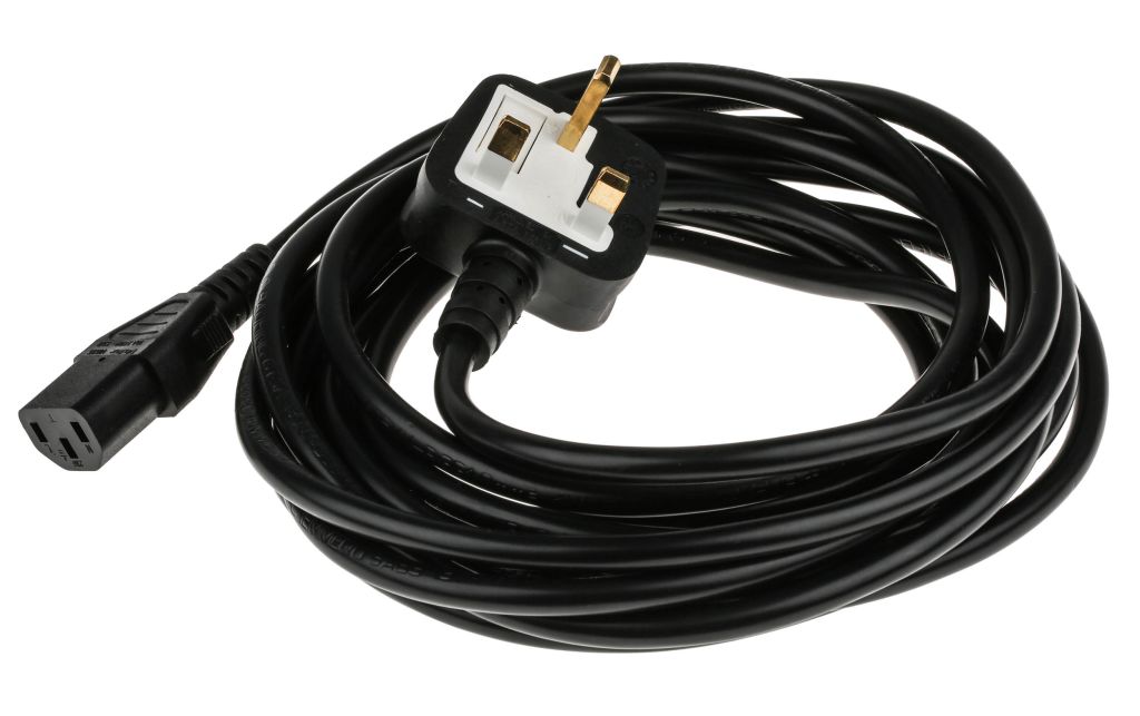 From RS Pro a high quality and durable power cable assembly or power cord for connecting an appliance to a mains power supply. This power cord is fully equipped with a UK BS1363 3 pin mains plug on one end and an IEC C13 type connector on the other that connects to the appliance. The power lead features integrated strain reliefs that provide additional protection and support to the connectors and prevent damage caused by excessive bending