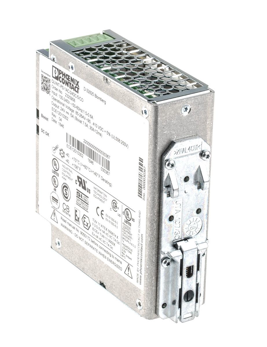 | Product description | Phoenix Contact QUINT-PS/1AC/24DC/5/CO Switch Mode DIN Rail Power Supply 85 → 264V ac Input, 24V dc Output, 5A |