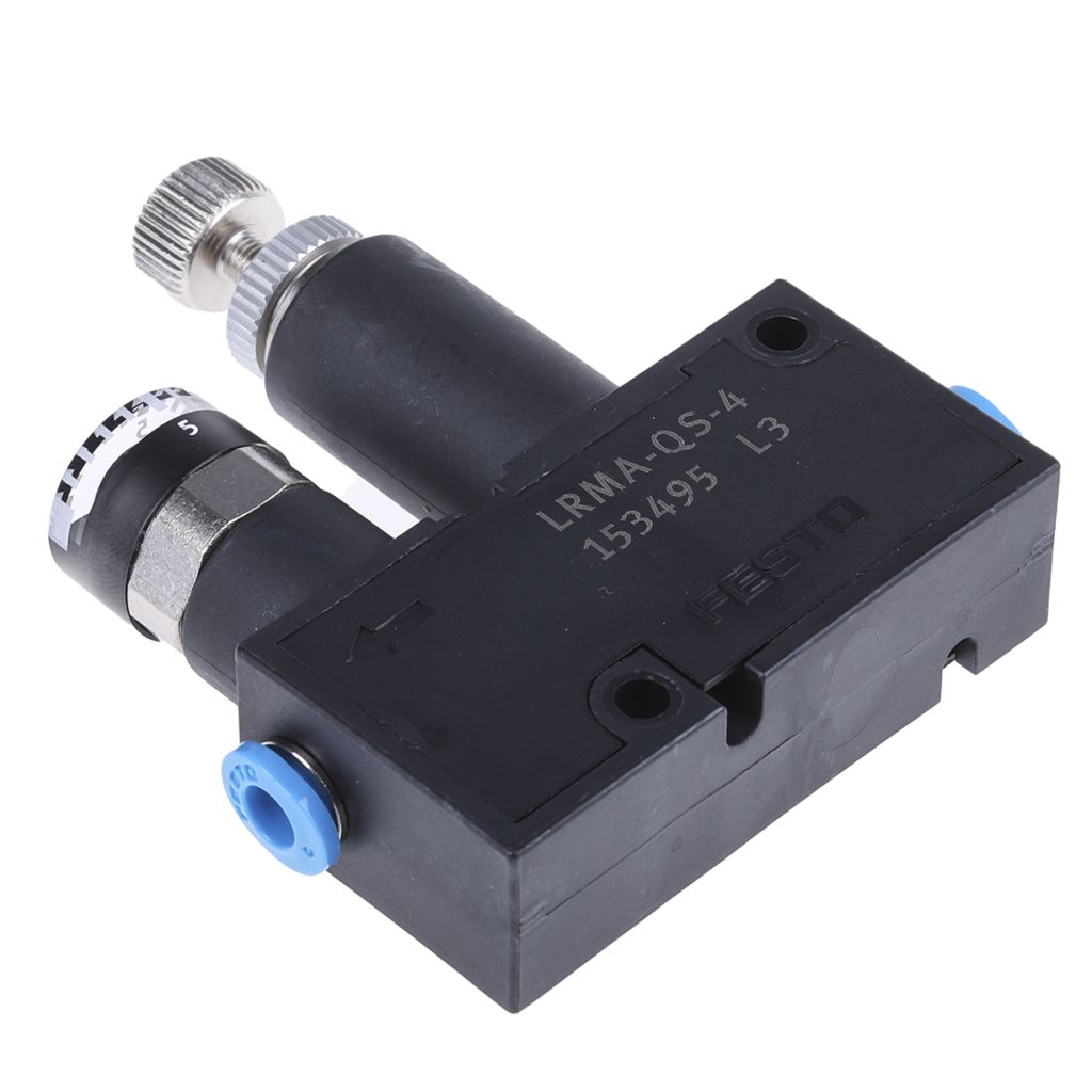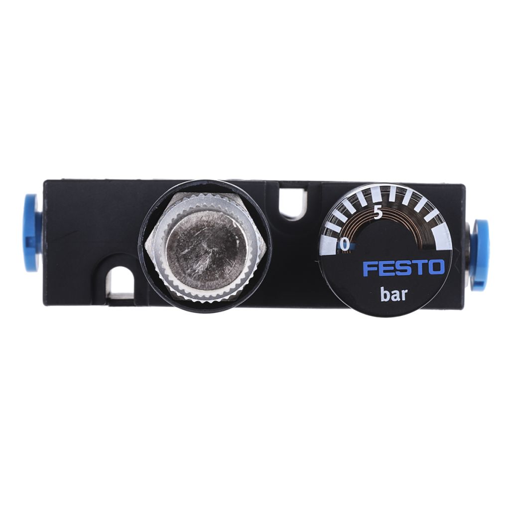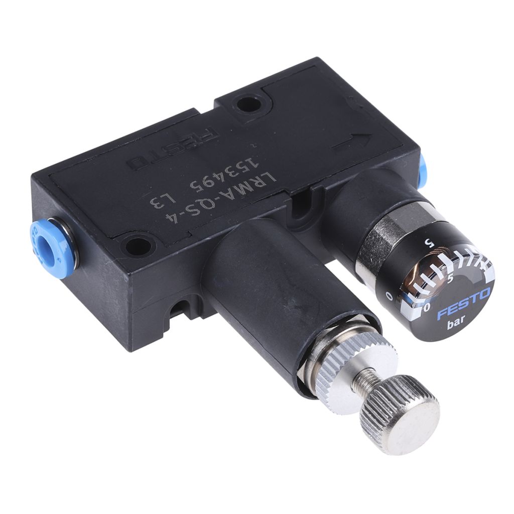 Festo LRMA series pressure regulator maintains a constant output pressure on the secondary side independent of pressure fluctuations on the primary side and air consumption. The primary pressure at the screw-in thread is reduced when air is exhausted from the QS push in connector. The LRMA series features a pressure gauge to give visible feedback from the unit.