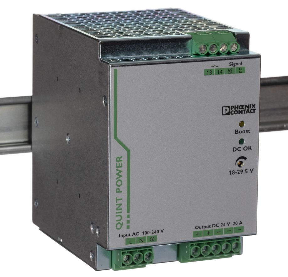 | Product description | Phoenix Contact QUINT-PS/1AC/24DC/20 Switch Mode DIN Rail Power Supply 85 → 264V ac Input, 24V dc Output, 20A |