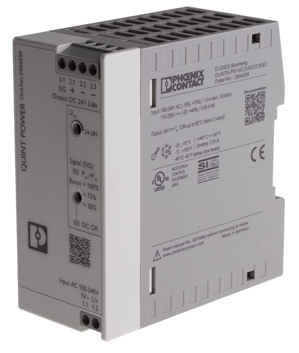 | Product description | Phoenix Contact QUINT4-PS/1AC/24DC/3.8/SC Switch Mode DIN Rail Power Supply 230V ac Input, 24V dc Output, 3.8A 90W |
