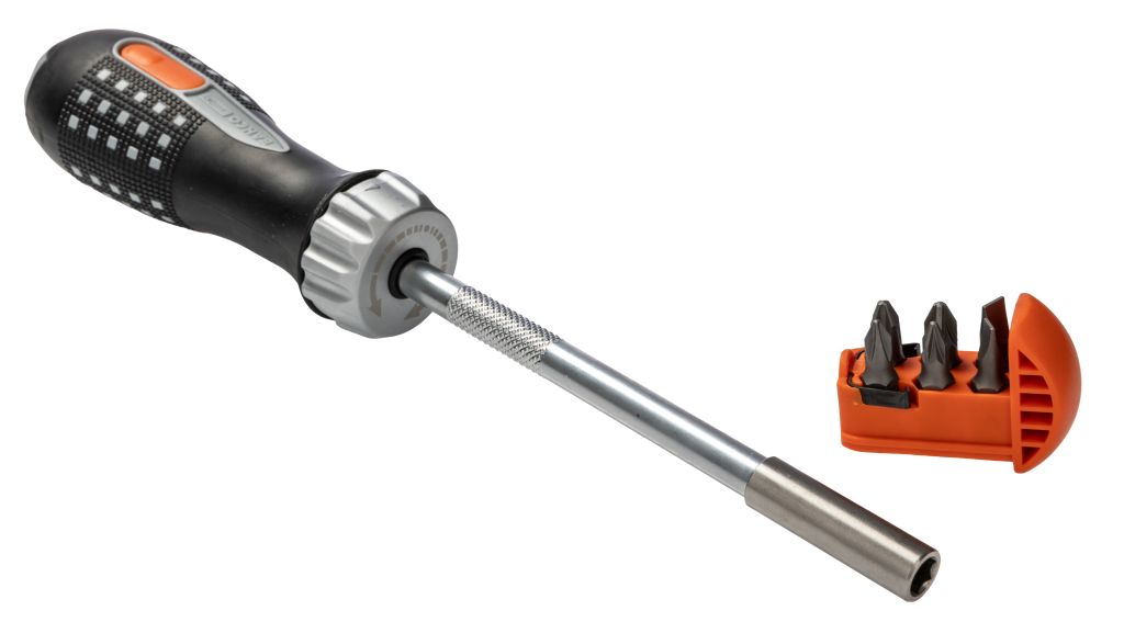 Bi-material ratcheting screwdriver with bits storage, includes six bits stored in handle with release button for quick access.