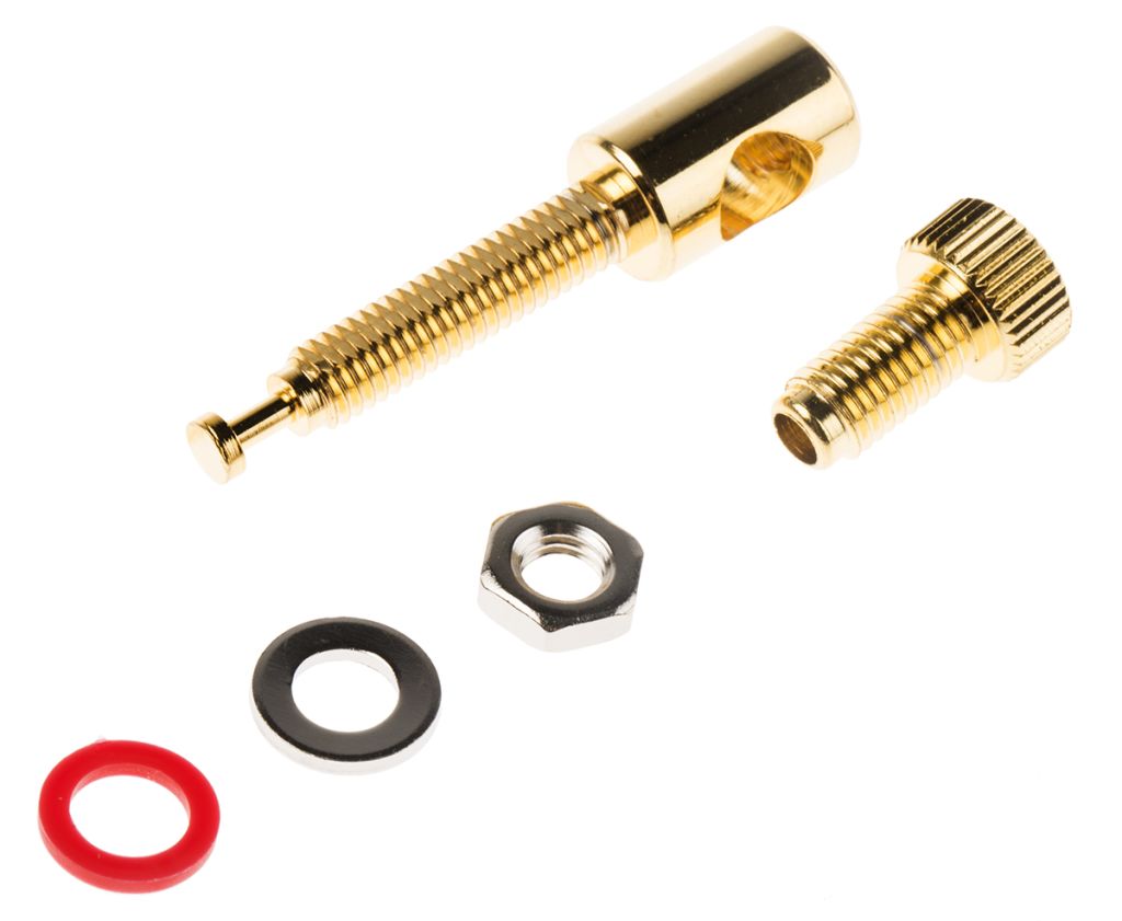 High quality, gold plated 4mm audio connectors. The plug is stackable with a large entry hole which accepts cable up to a maximum of 7.5mm O.D. or cable may be clamped via the knurled screw. The chassis terminal accepts 4mm plugs in the top, and again has a large entry hole to accept cable up to a maximum of 7.5mm O.D. Maximum panel thickness 20mm. Connectors are available colour coded in either red or black. For suitable cable see stock no. 460-190.