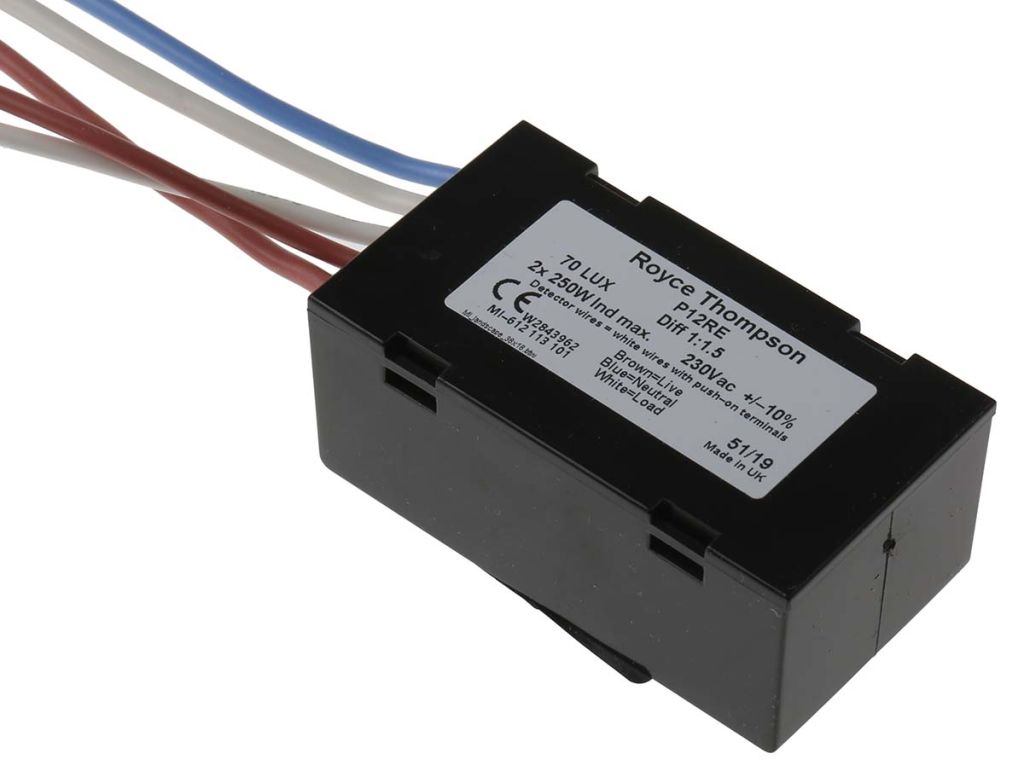 These controllers automatically turn lights 'ON' and 'OFF' in response to changes in ambient light levels, primarily the transition from day to night and vice-versa. The more advanced types (see note below) have inbuilt logic to minimise false triggering, whereas the remainder have inbuilt time delays or higher 'OFF' thresholds, to prevent on/off cycling. As a general rule, these controllers should be sited such that they are not illuminated, by the light they are controlling. Nominal supply voltage is 230Vac.,Note regarding energy-saving negative-hysteresis controllers,Where figures for the 'OFF' threshold are lower than for the 'ON' threshold, the sensor is designed such that four thresholds are actually monitored. These are: dusk, the middle of the night, dawn and the middle of the day. Monitoring at times other than dusk and dawn enables the sensor to determine what it should be looking for next, minimising false triggering and improving overall controller operation.