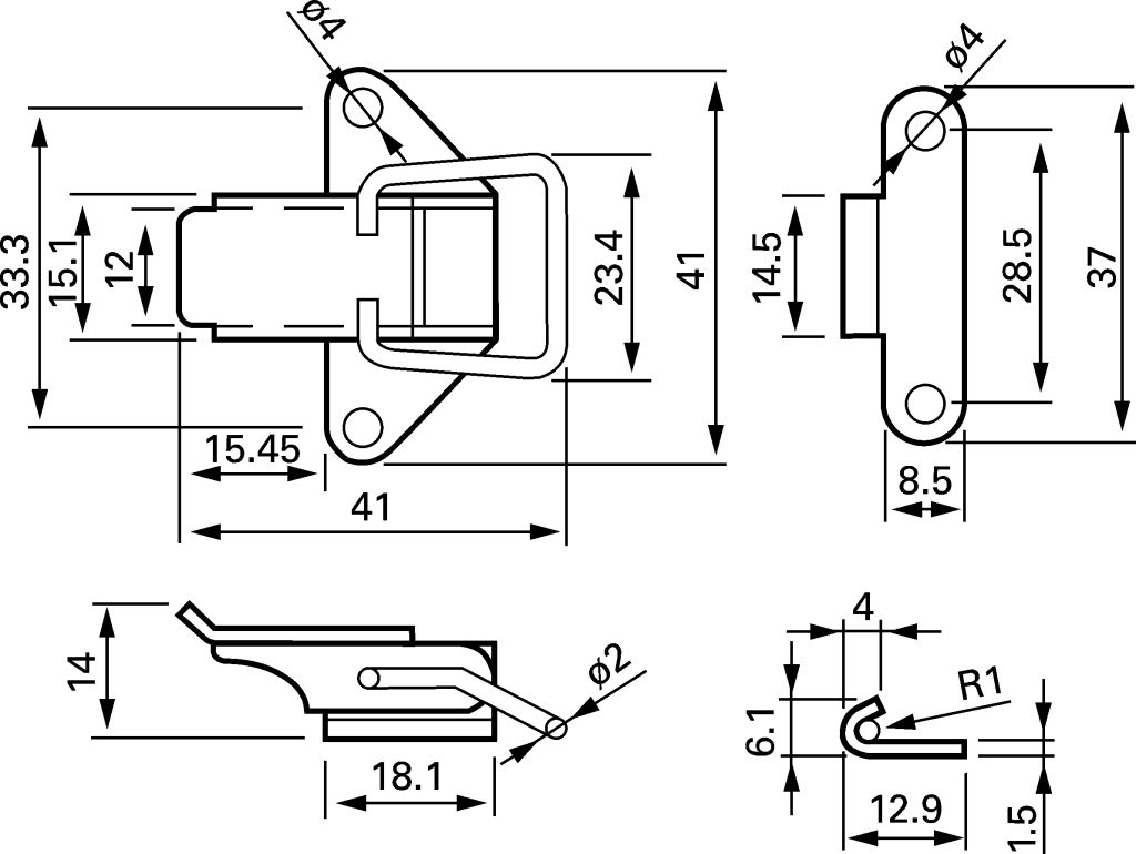 RS PRO popular and widely used toggle latches with a length of 41 mm, width of 41 mm and depth of 14 mm. These small toggle latches are ideal for wooden cabinets.