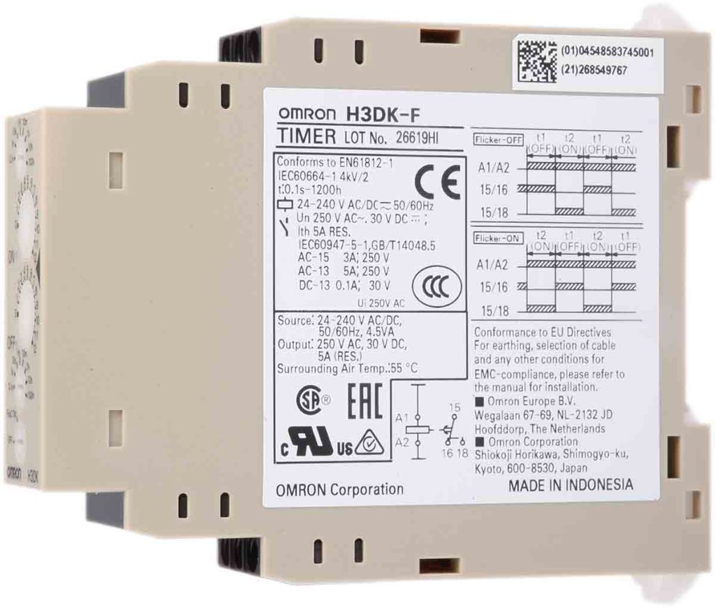 | Product description | Omron Multi Function Timer Relay, 24 → 240V ac/dc 0.1 → 1.2 s, 1 → 12h, DIN Rail Mount |