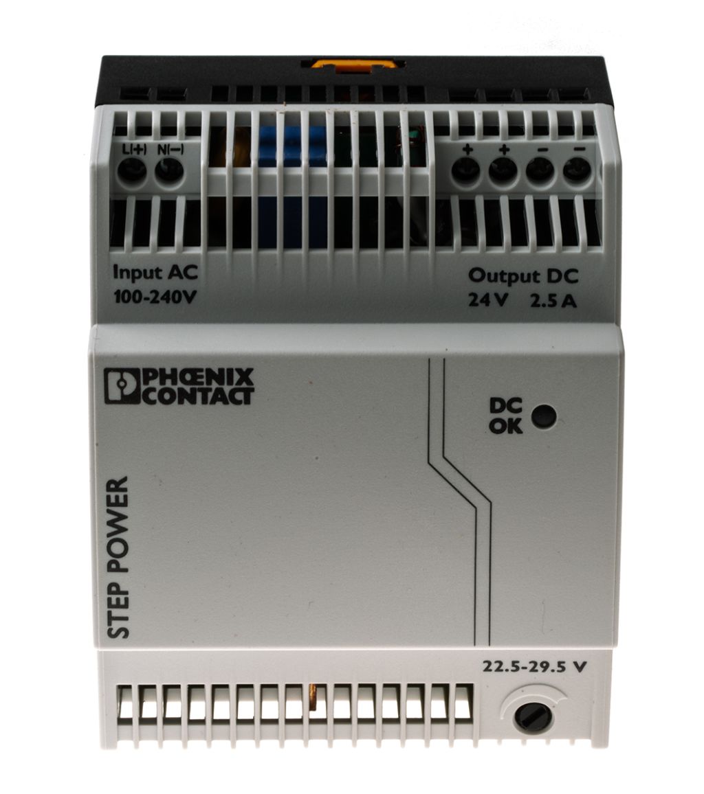 | Product description | Phoenix Contact STEP-PS/1AC/24DC/2.5 Switch Mode DIN Rail Power Supply 85 → 264V ac Input, 24V dc Output, 2.5A |