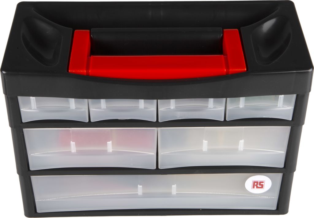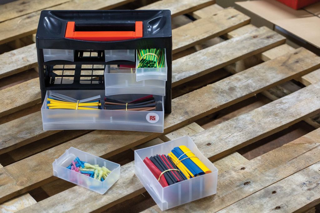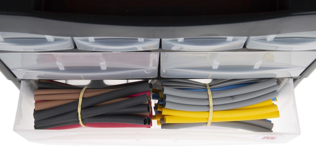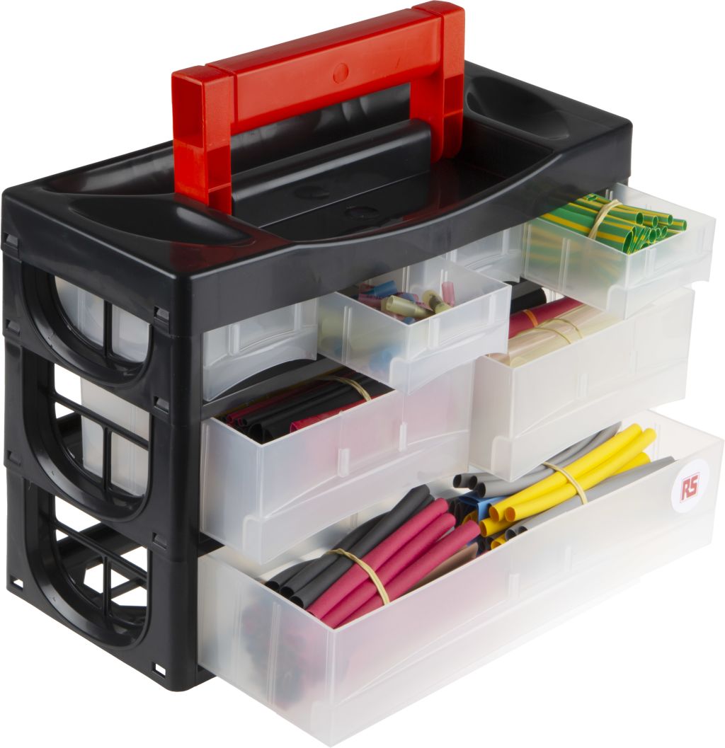 From RS Pro a portable heat shrink kit consisting of a range of high-quality heat shrink tubing. The tubing contained in this versatile kit is in a range of colours, (including harmonised colours) and diameters to suit a range of different applications. The box itself is made from plastic with clear ’click’ close draws and a carrying handle on the top. The box can also be stacked or wall mounted for easy access