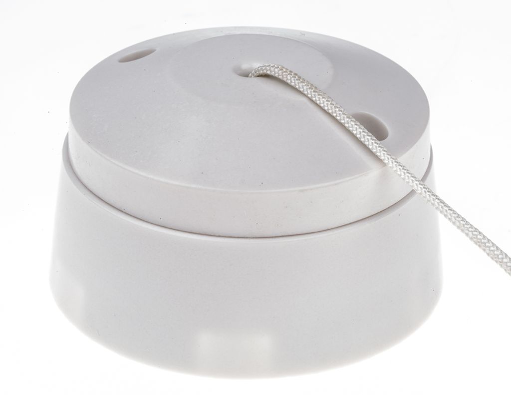A white moulded ceiling mounting pull switch. Cord length 1·5m. The switch is supplied complete with back box.