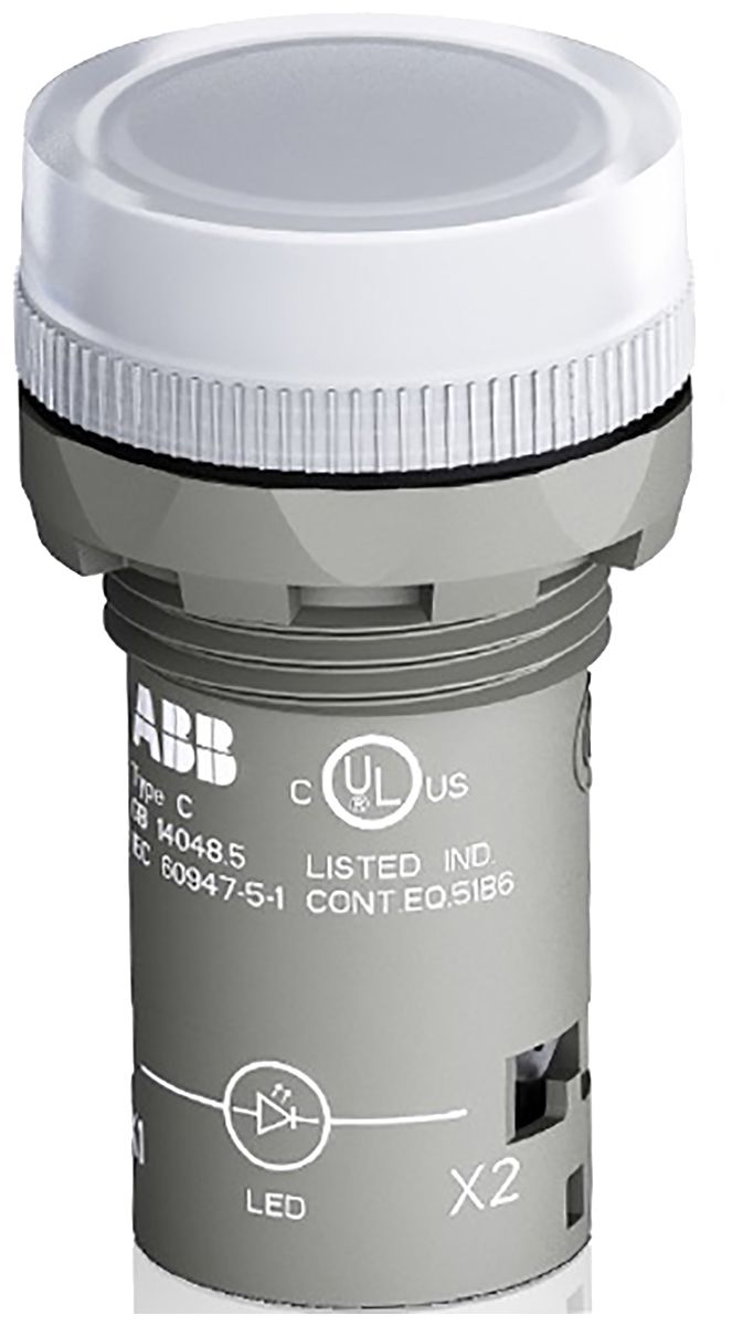 ABB, Panel Mount White LED Pilot Light, 22mm Cutout, IP66, IP67, IP69K, Round, 24 V ac/dc