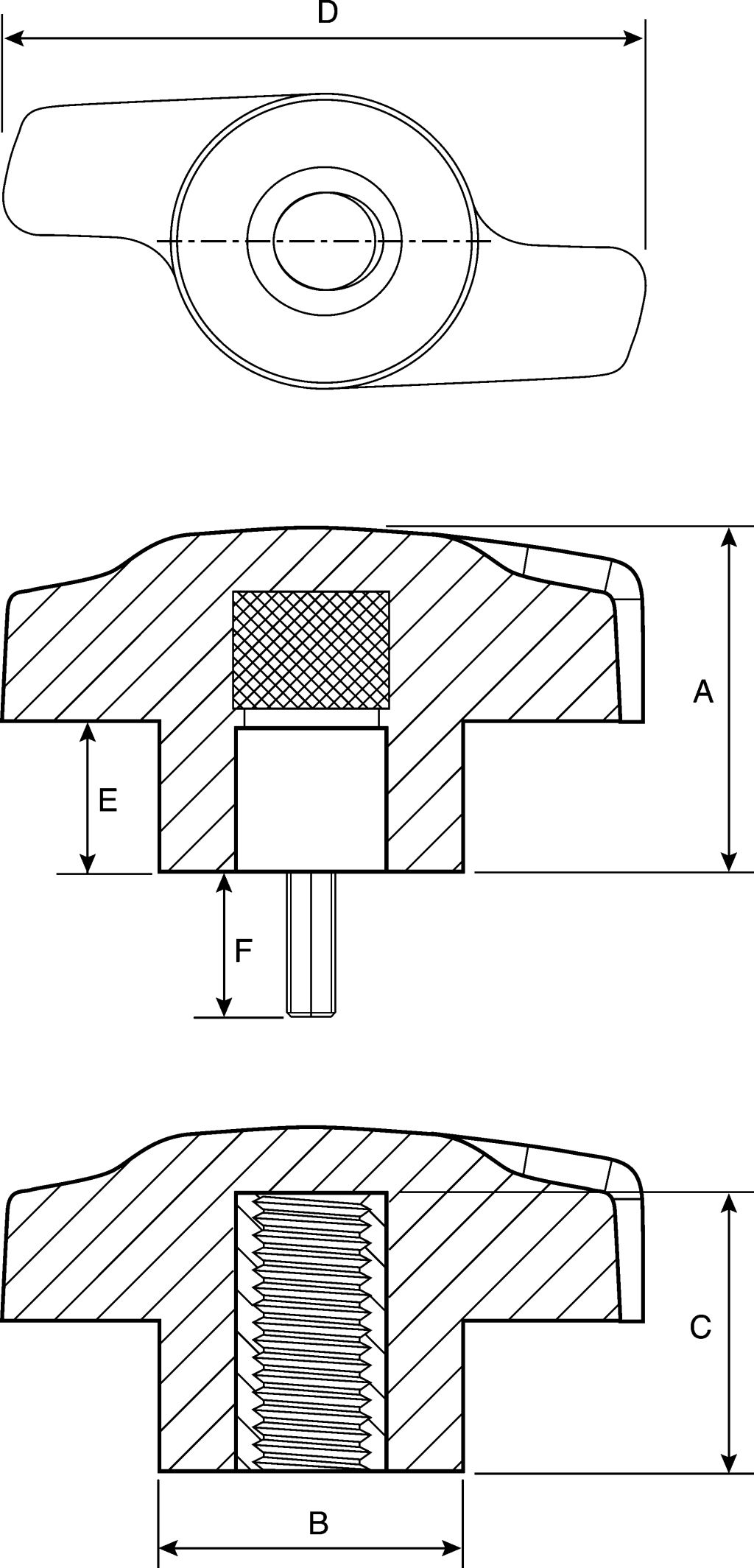 Offset winged handwheels have an ergonomic shape to provide more user comfort when adjusted by hand, with offset designs sometimes being more suitable over straight winged knobs, depending on the intended application, required pressure and desired aesthetic. The knobs are fitted with either a protruding screw (male) or a threaded insert (female) depending on the requirements of the application.