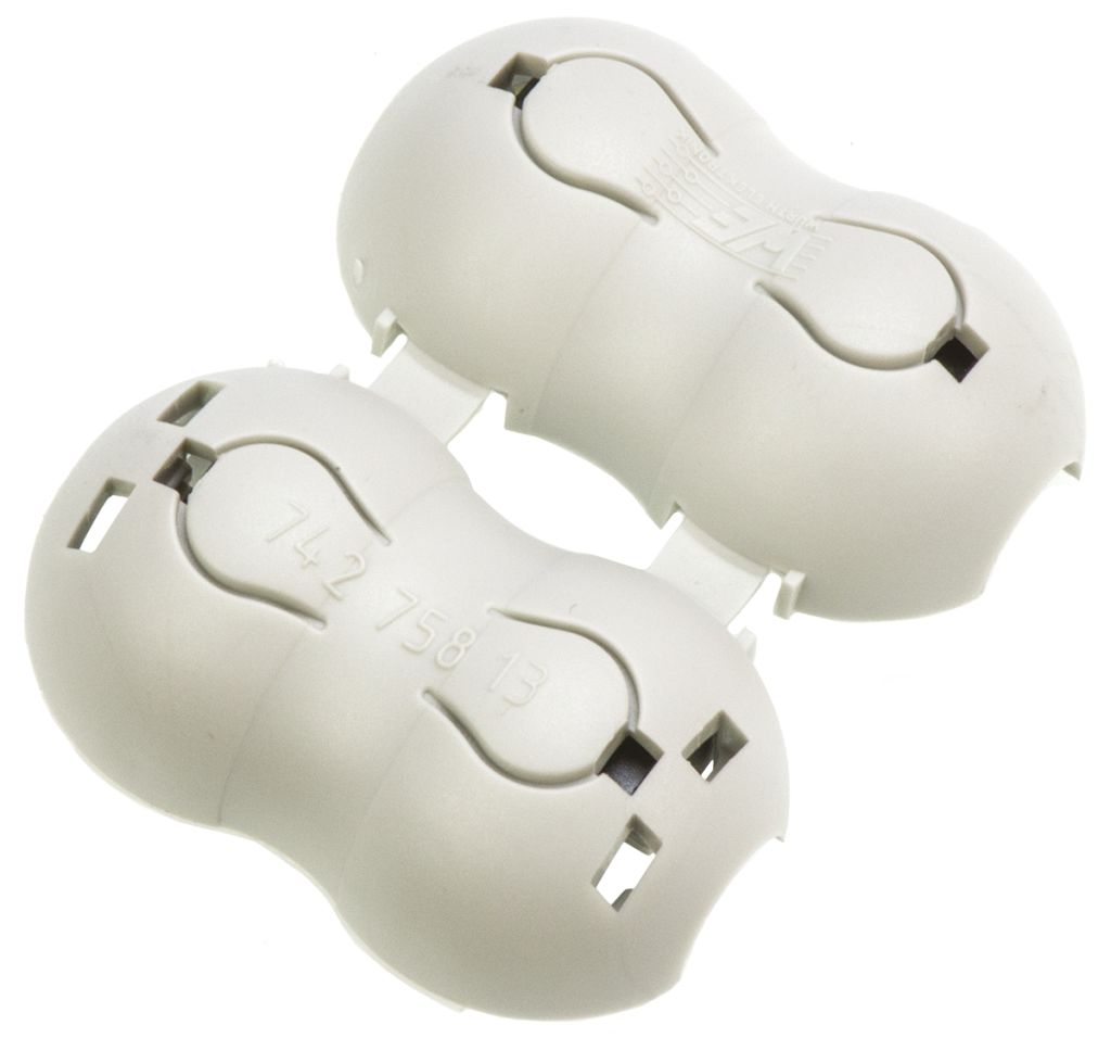 These split ferrite cores reduce the electromagnetic interference from being induced in or radiated from data and power cables. High attenuation ratings are achieved with the housing design and the special process steps during the ferrite manufacture. The special snap lock makes the ferrite sleeve suitable for use with a variety of cable diameters and once the split ferrite is locked it cannot be opened accidentally.The outer housing is designed to protect the halves of the core from breakage and ensures simple assembly on to cables that are already installed or which have been fitted with connectors. Fixing to the cable with glue or cable tie is optional. Typical applications for these split ferrite cores include data or power lines used in computer technology, terminals, industrial controllers, medical engineering and office machines.